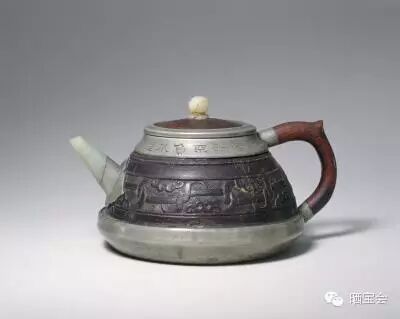 宜興窯石楳款紫砂胎鑲玉檳榔木壺,清道光,高9cm,口徑6.5cm,底徑12cm。