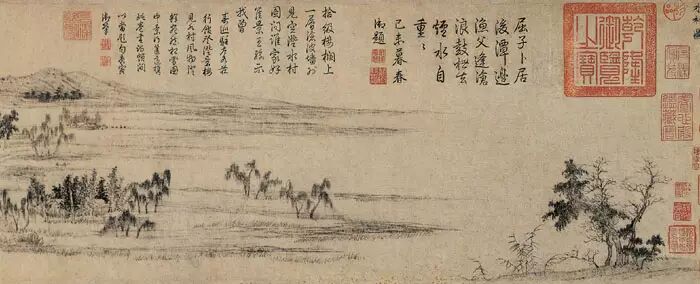 比如下面這幅《水村圖》,元代趙孟頫所作,右上角十分扎眼的就是一方“乾隆御覽之寶”。
