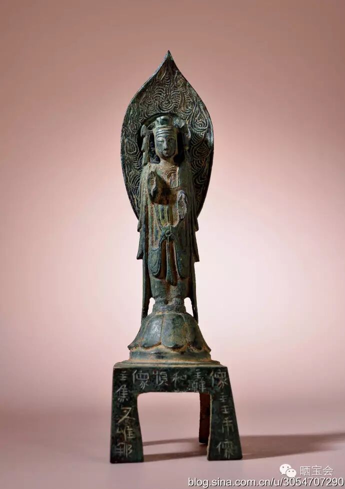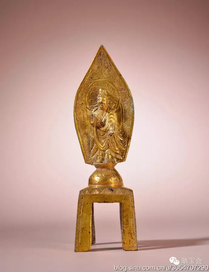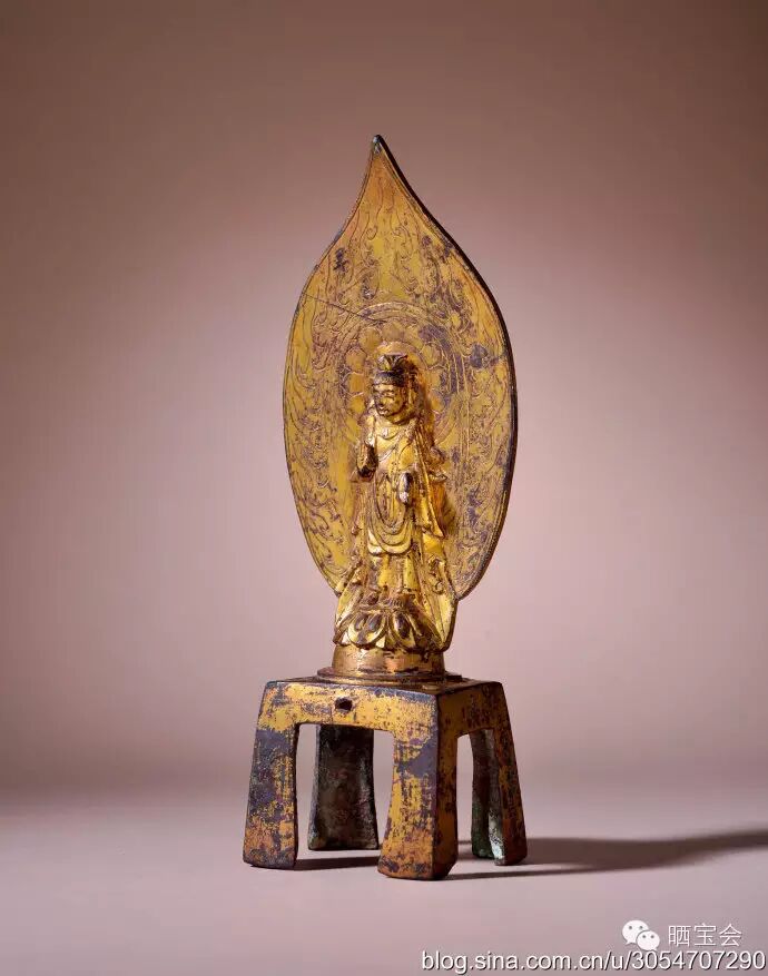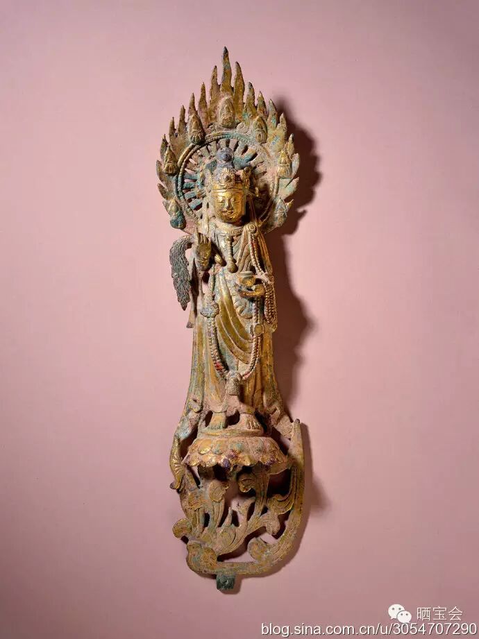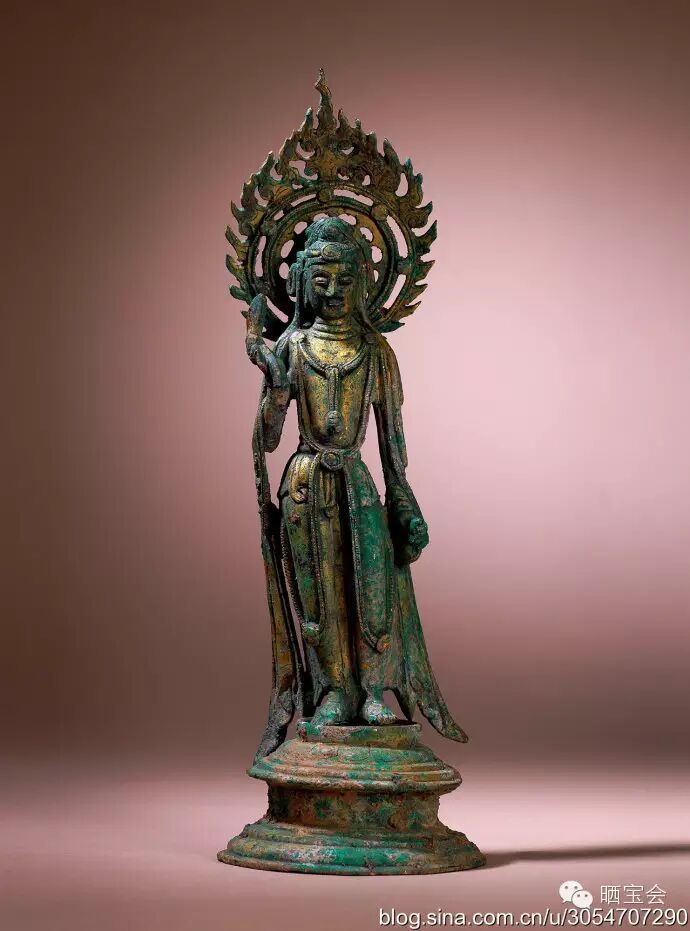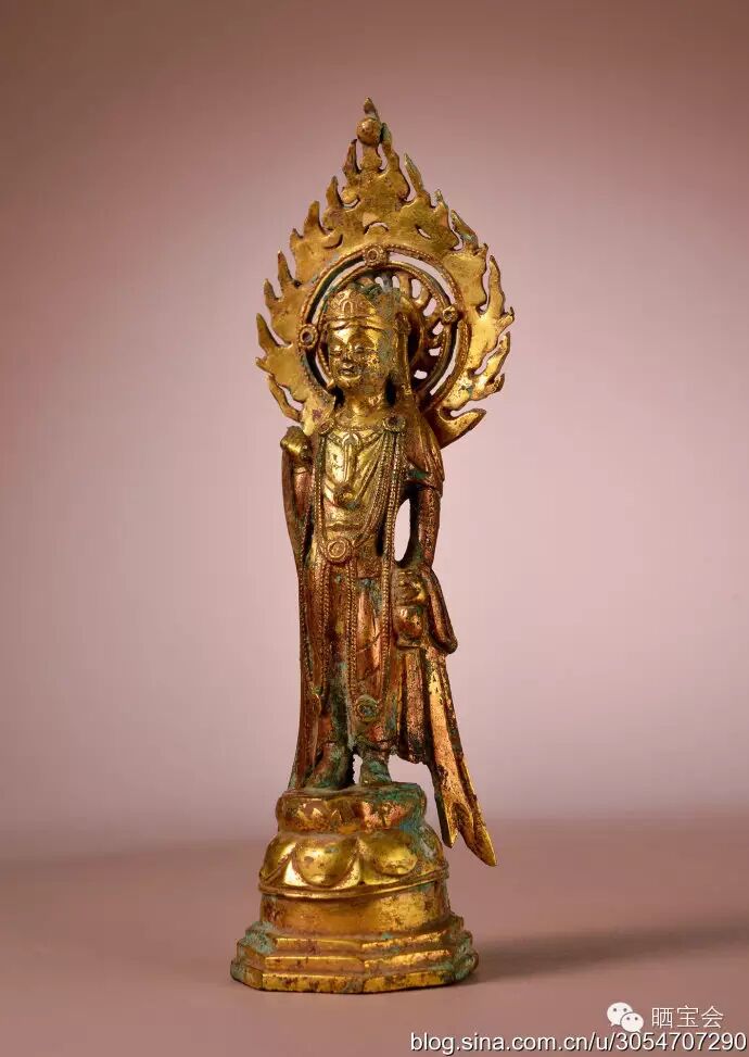此尊隋銅鎏金觀音菩薩立像連座帶分體火焰型背屏,鎏金與胎體結合緊密,金水大部分保留,亦遍布青綠銅鏽,古樸素雅。觀音臉圓潤,五官清晰銳利,彎眉直鼻,神態靜謐,頭戴寶冠,帔帛沿耳後順腦側自然下垂,右手持楊柳枝,左手持淨瓶,連珠式瓔珞呈8字形交叉垂於體前,兩肩處飾玉璧,胸前懸鈴,指向腹部,身體姿態微向右傾,略具動感,從側面看腹部突出,顯得精神挺拔,表現出一定程度的北魏造像遺風,但疏朗自然之氣質則更符合隋菩薩造像之審美。