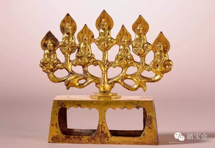 自隋代在中國開始流行的七連佛為佛教雕塑中極為獨特的題材,代表著釋迦牟尼佛在成佛之前的六位佛,加上釋迦牟尼佛,即為過去在娑婆世界度眾的“七佛”。七佛造像始於阿育王時代的山奇大塔上,當時是以並排的七株菩提樹或七個塔來表示,犍陀羅藝術中有完整的七佛並排站立。我國在魏晉南北朝時期的七佛題材常出現於佛寺、石窟造像之中,且多承接了犍陀羅式之風格,典型的如雲岡石窟的七佛壁等。至隋代開始出現此類銅鎏金台座形塑像,至唐代題材不變,而整體造型更加和諧規律,內容更加豐富,極有時代風貌